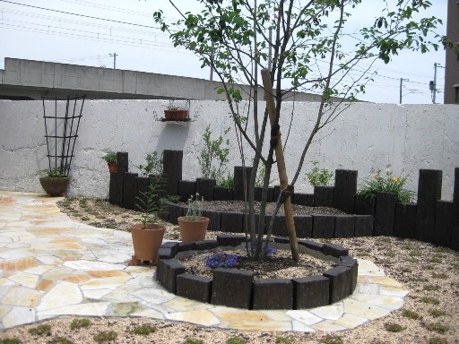 M様邸のお庭のエクステリア施工・造園工事を行いました。エクステリア施工内容は、庭の園路として、枕木と延べ石と化粧砂利敷き、一部レンガ風ブロック敷きと石英岩の石貼り花壇の縁の土留めとして、枕木に似せたコンクリート製のブロックにて施工しました。ジューンベリーをシンボルツリーとしました。